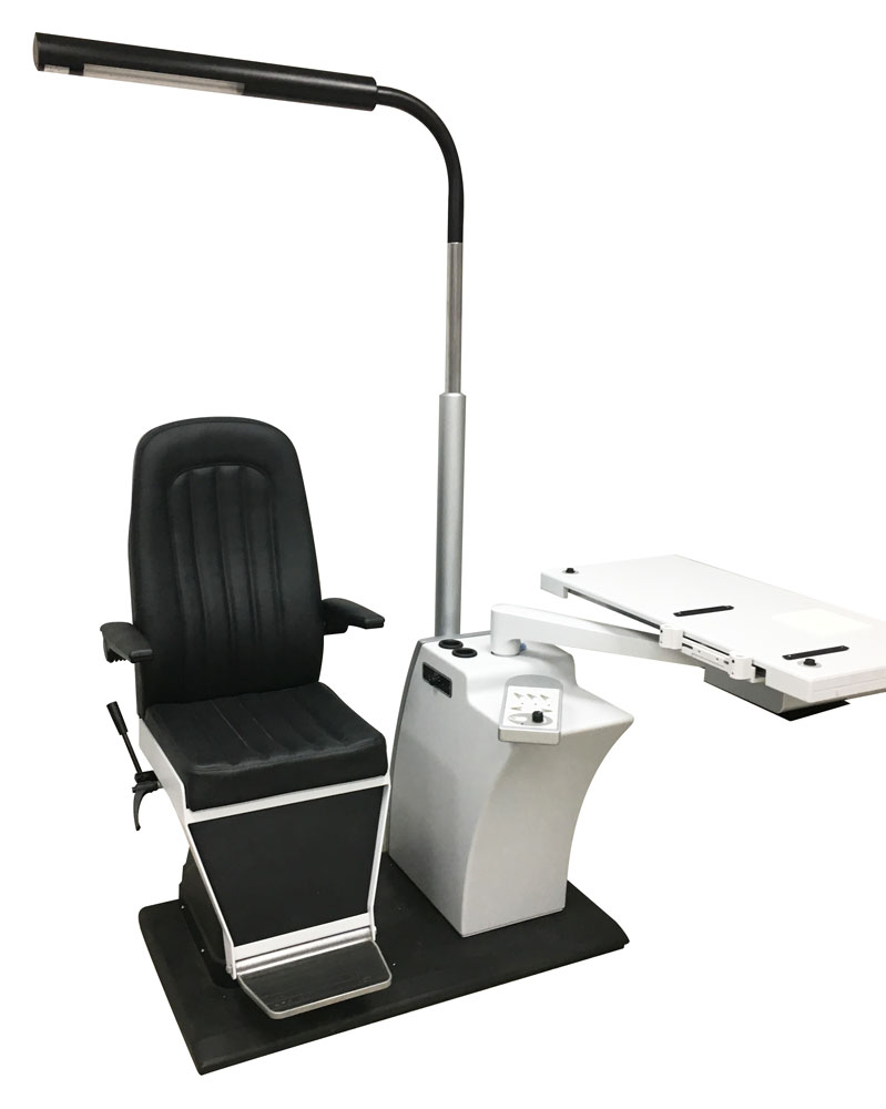 The slender shape, the rotation main panel, the magnetic lock for the translating table top, the power supply of the instruments, the adjustment of the light intensity of the slit lamp are all features of this unit.