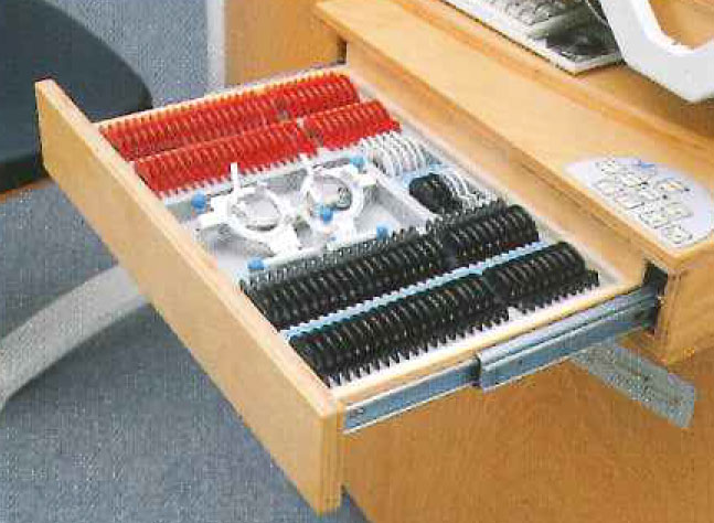 The Concepta has been developed as a refraction unit without compromise. This means that you have all instruments and information immediately at hand for refraction and topography (if desired) for refractive surgery patient information and for dispensing corrective and contact lenses. A set of measuring lenses can also be stored in a specially provided corrective lens drawer. The input and output units of the PC (optional), the keyboard and the flat screen monitor are swivel mounted to keep them within reach whenever required. The vision tester's support arm automatically lowers into position in front of the patient when desired. The control panel of the computerized vision tester is within easy reach of the examiner on the tabletop.